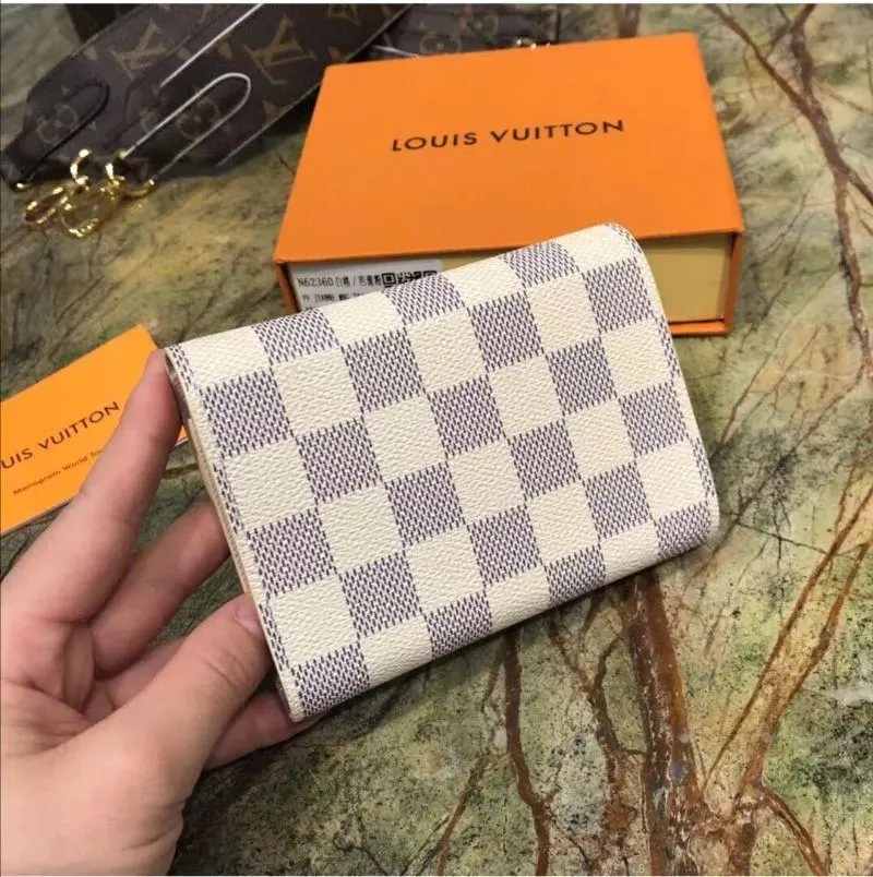 ダミエ・アズール キャンバスでコンパクトに仕立てた「ポルトフォイユ・ヴィクトリーヌ」。内装にカード用スロット、紙幣とコイン用のポケットを備えた機能性と、フェミニンな雰囲気を融合させたアイテムです。グレインレザーのライニングでアクセントを添え、エンヴェロップ型のフラップにはライニングと同じカラーのスナップをあしらいました。